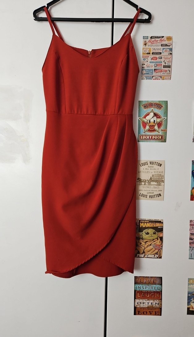 Kiremit rengi, askılı ve drapeli tasarıma sahip, vücuda oturan abiye elbise. Minimalist ve parlak dokusuyla romantik akşamlar için uygun.