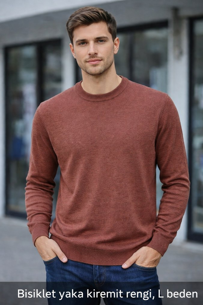 Kiremit renginde, bisiklet yaka ve uzun kollu, yumuşak yün kumaştan yapılmış erkek kazak. Günlük rahat kullanıma uygun, desen içermeyen, rahat kesim model.