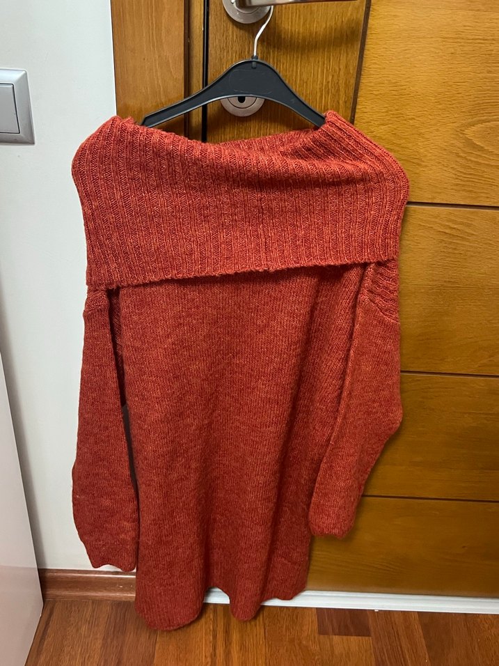 Kırmızı örgü kazaktır. Rahat ve bohem tarzda günlük kullanım için uygundur. Uzun olduğu için tayt ve botlarla kombinlenebilir. Hiç giyilmedi. Bana hediye gelmişti etiketi duruyor ancak fiyat kısmı koparılmış.