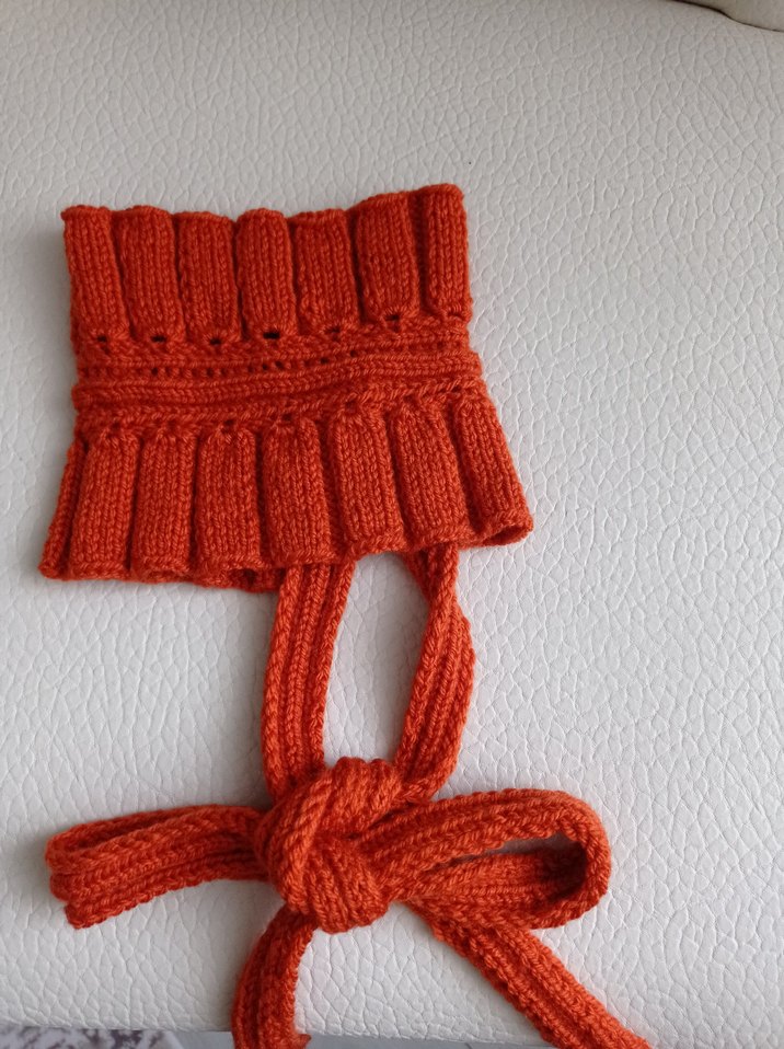 Yumuşak dokulu, kiremit rengi örgü boyun bağı, ayarlanabilir kullanım için bağcıklı tasarıma sahip. #örgü #atkı #boyunbağı #fular #hediye #keşfet #fırfırlıatkı