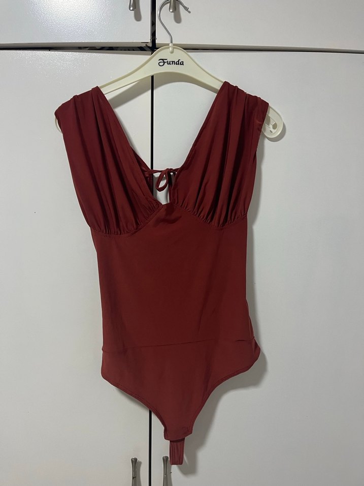 Kiremit renkli, arkası bağlama detaylı çıtçıtlı bluz