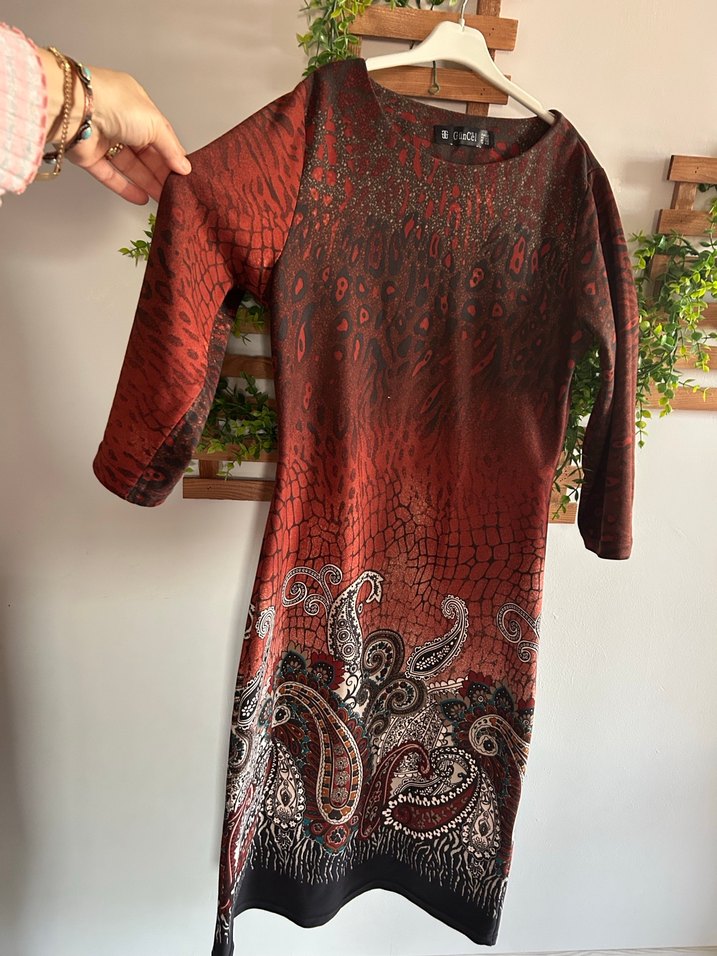yine kusursuz muhteşem bir elbise. tüm ölçüler mevcut.iade kabul etmem. kiremit renkli, uzun kollu, bohem tarzda midi elbise. desenli, drapeli ve vücuda oturan kesime sahip, günlük kullanım için uygun.