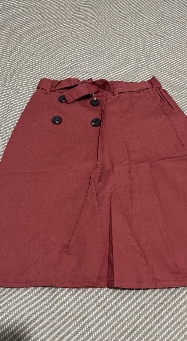 Bordo renkte, düğmeli detaylara sahip bol kesim midi etek. Sentetik kumaştan üretilmiştir ve günlük kullanıma uygundur.