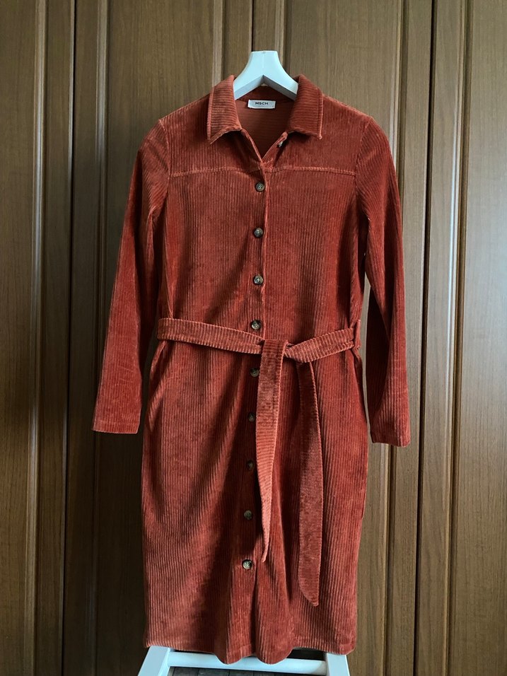 Danimarka markası MSCH nin Türkiye üretimi ihraç fazlası ürünü, kiremit rengi pamuk ağırlıklı kumaştan fitilli kadife gömlek elbise. Kemeri, roba dikişi ve arkasındaki plikaşe detayları spor/şık bir görünüm veriyor. 1-2 kez kullanıldı, yeni ve temiz durumda. Etiket bedeni S ama oversize modeli ile L’ye dahi uygun, ölçüleri fotolarda mevcuttur.