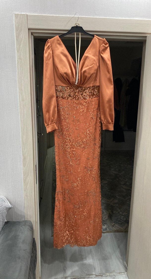 Kiremit rengi İşlemeli Uzun Kollu Kadın Abiye Elbise
