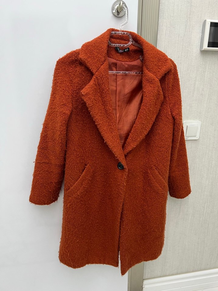 Kiremit renkli uzun kadın kaban, yumuşak kumaştan, tek düğmeli. İki koltukaltı arası 47cm, boy 87cm.