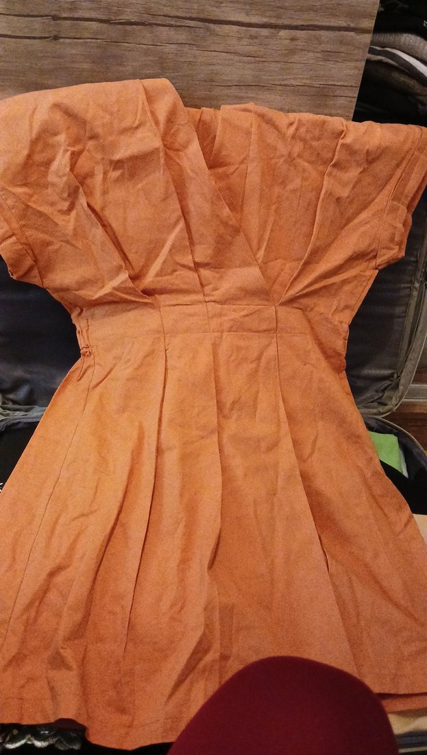 kiremit rengi kumaştan, drapeli ve V yakalı, midi kesim, kolsuz, vintage bohem tarzda, fit kesim elbise. ✨