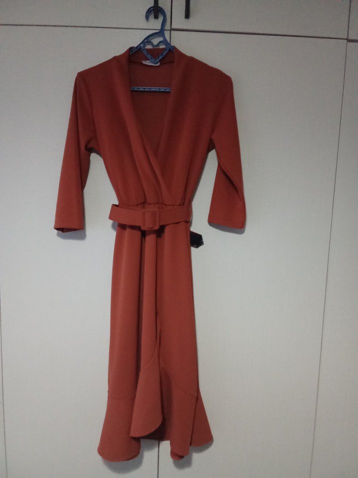 Bu kiremit rengi, midi uzunlukta, vücuda oturan elbise minimalist ve normcore tarzda. Askılı kollara ve kemerli bele sahiptir.