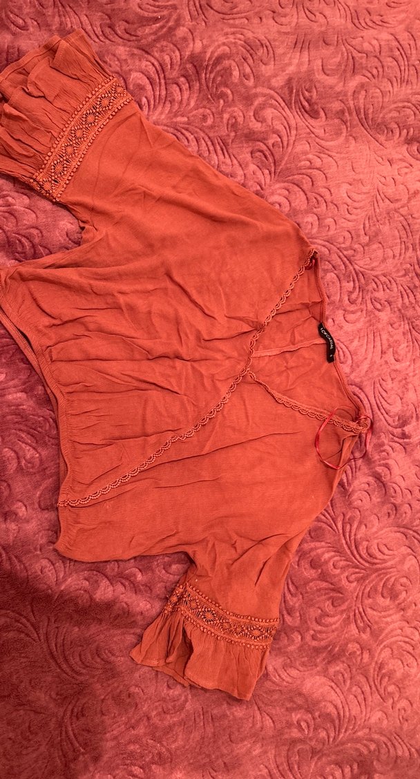 Keten kumaştan, yarım kollu , V yakalı ve nakış detaylı kiremit rengi bohem tarzda bol kesim kısa bluz. Fırfır süslemeleriyle günlük kullanıma uygundur.