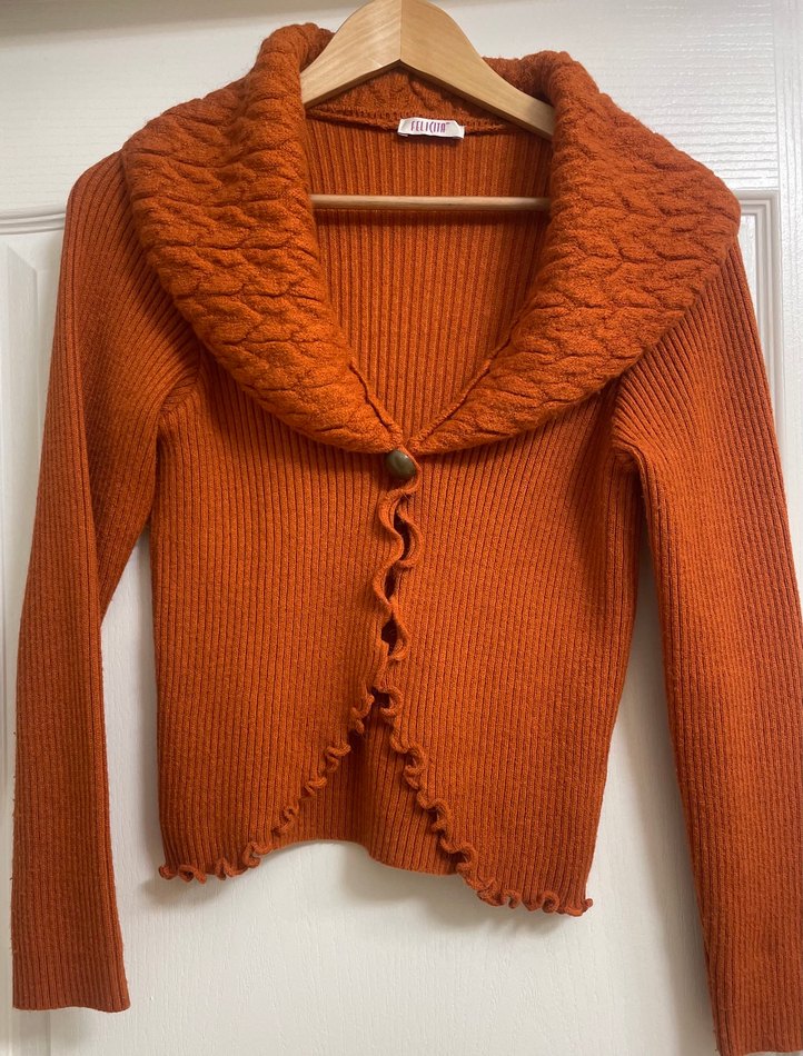Fitted kesim, kiremit rengi örgü bohem kadın hırka. Yumuşak örme kumaş, yakalı, uzun kollu, parlak dokulu, fırfırlı etek ucu ve tek düğmeli kapanışa sahip, günlük kullanıma uygun.