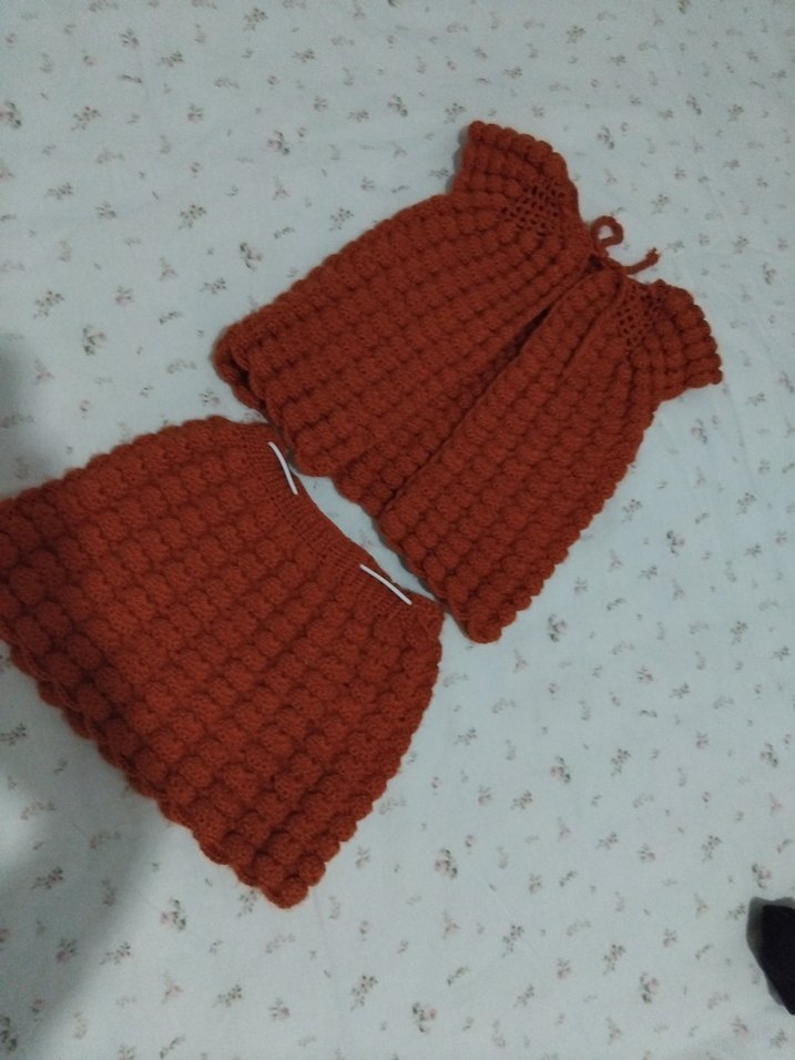 kiremit rengi, örgü kolsuz üst ve uyumlu etekten oluşan bebek kız takımıdır. 1-2 ve 3 yaş bebek uyumlu 2 defa giyildi tertemiz