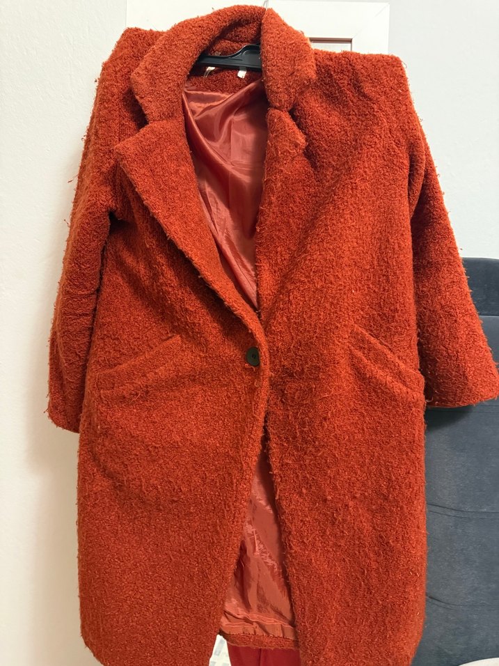 Tek düğmeli, peluş dokulu turuncu kaban. İki ön cepli ve astarlı, rahat kullanım sağlar.