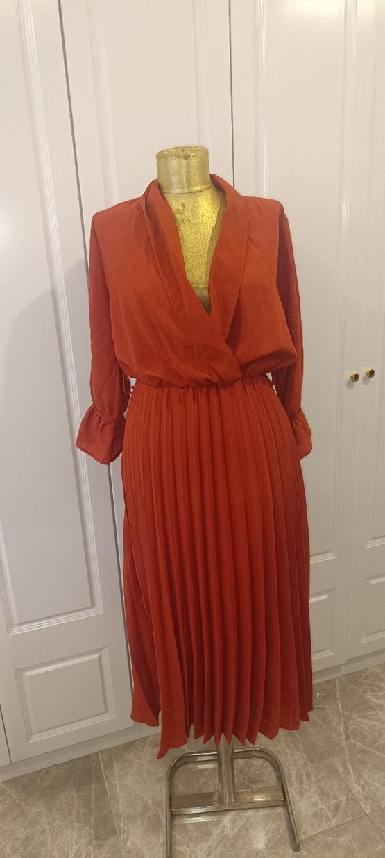 kiremit rengi Piliseli Uzun Kadın Elbise