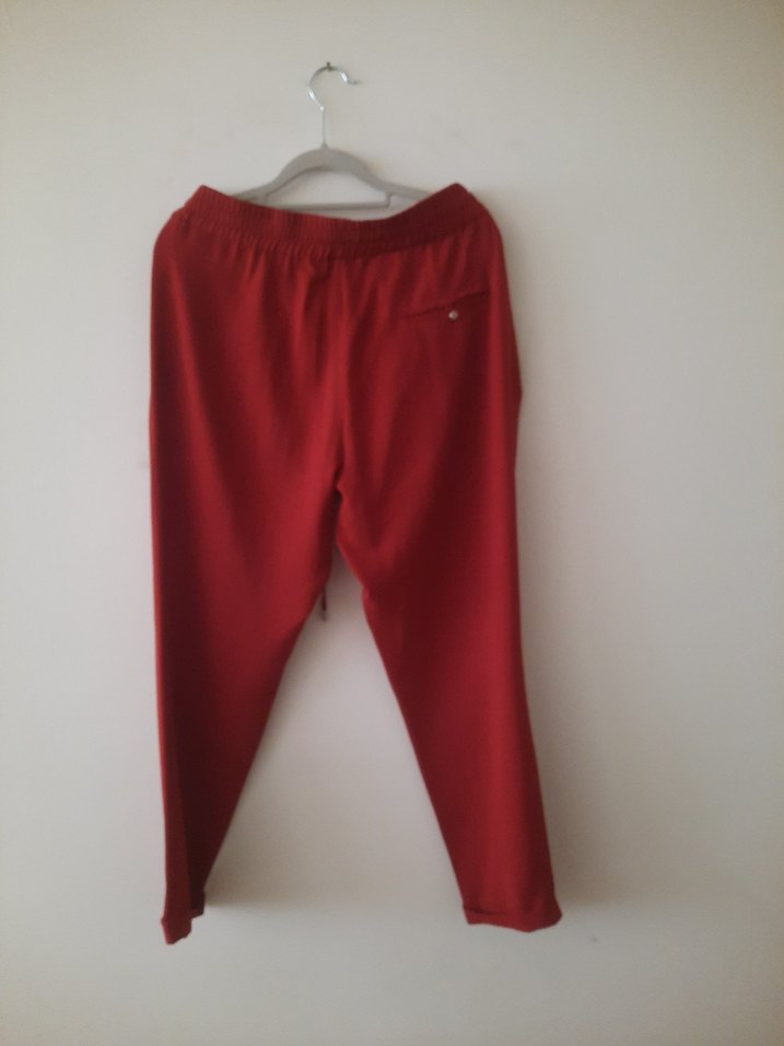Kiremit renkte, rahat kesim ve midi boyda, yumuşak dokulu kadın pantolonu. Günlük ve sokak stili için uygundur. Havuç pantolon.