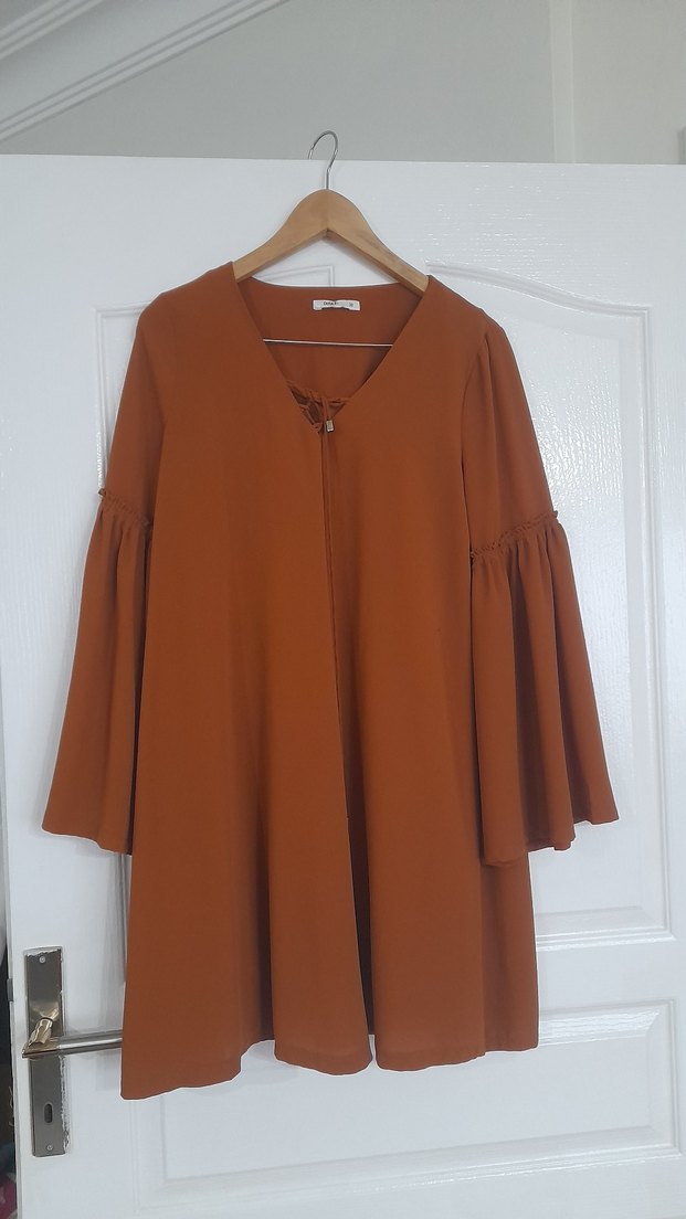 Kiremit renkli, uzun ve dökümlü kollara sahip, V yaka ve salaş kesim bohem tunik. Parlak görünümlü sentetik kumaştan yapılmıştır.