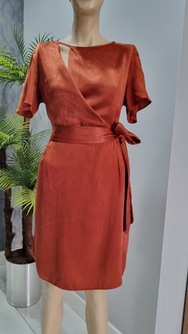 Kiremit rengi saten mini elbise, V yaka ve kısa kollu. Kuşaklı bel detayıyla klasik ve minimal bir tarz sunar. Parlak dokusu ofis için uygundur.L beden