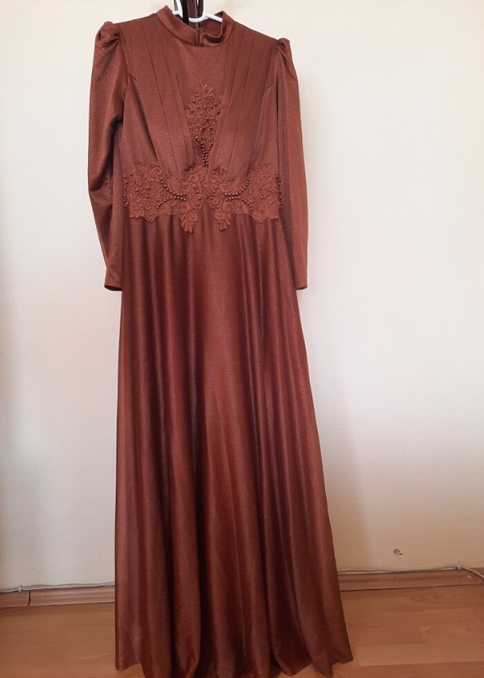 Kiremit rengi simli kadın abiye