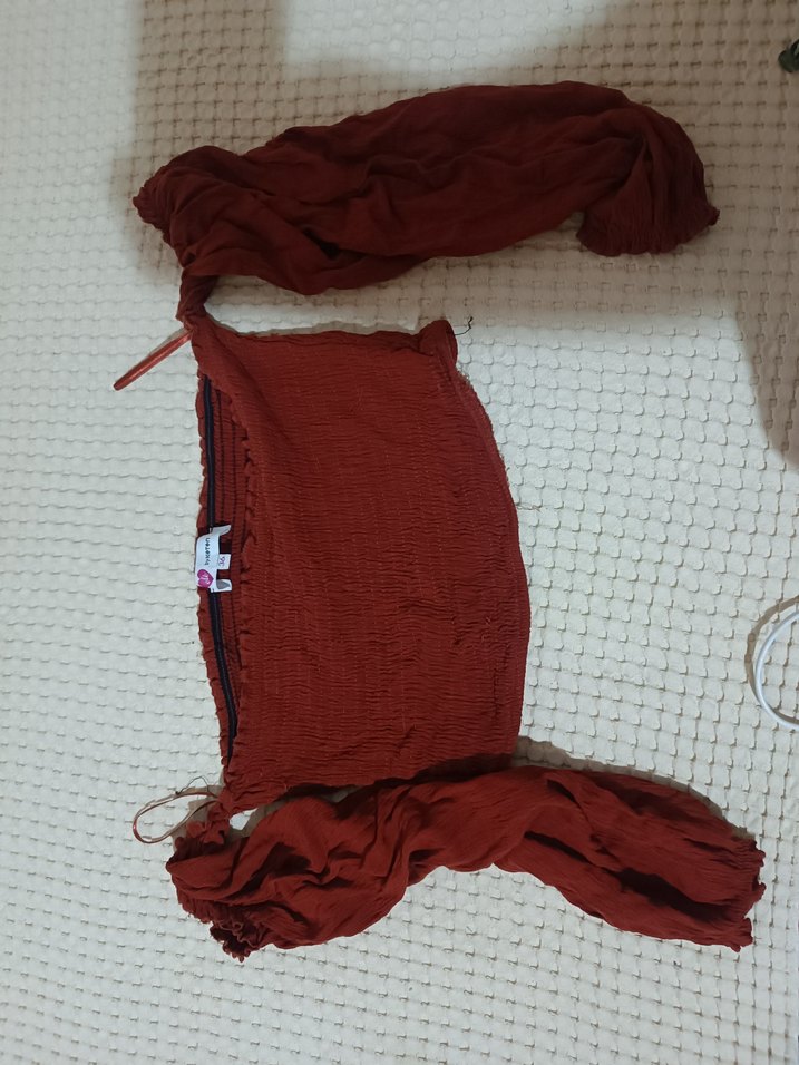kiremit rengi straplez, kolları drapeli bluz. 3-4 kez kullanıldı