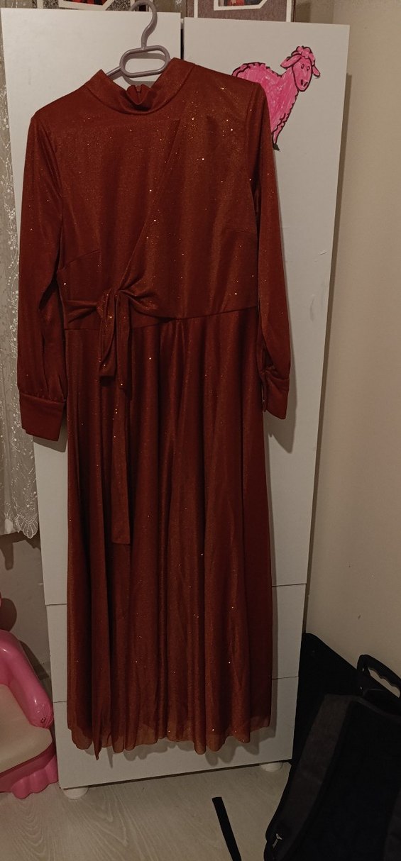 kiremit rengi , uzun kollu, yüksek yakalı ve bol kesim drapeli uzun elbise. Parlak sentetik kumaştan, düğün gibi özel günler için uygun şık bir model. ✨