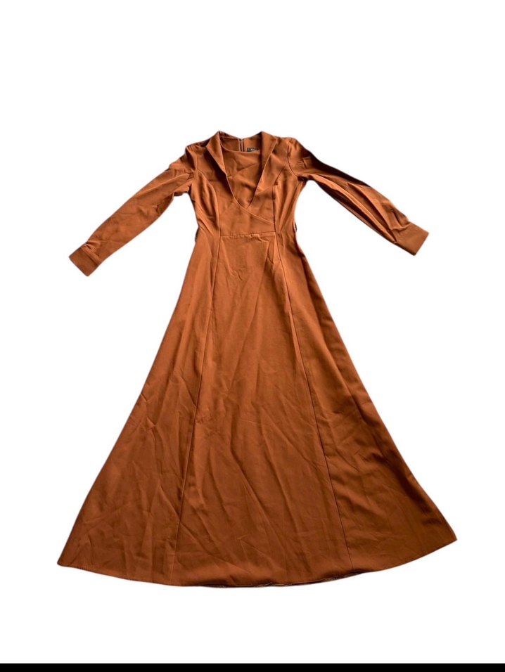 Kiremit rengi, uzun kollu, maksi boy elbise. Şık ve rahat bir görünüm için idealdir.