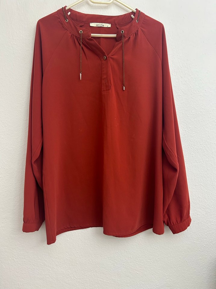 Kiremit rengi, yüksek yakalı ve düğmeli detaylı uzun kollu bol kesim kadın bluz. Günlük kullanıma uygun, sade ve şık bir tasarıma sahiptir.