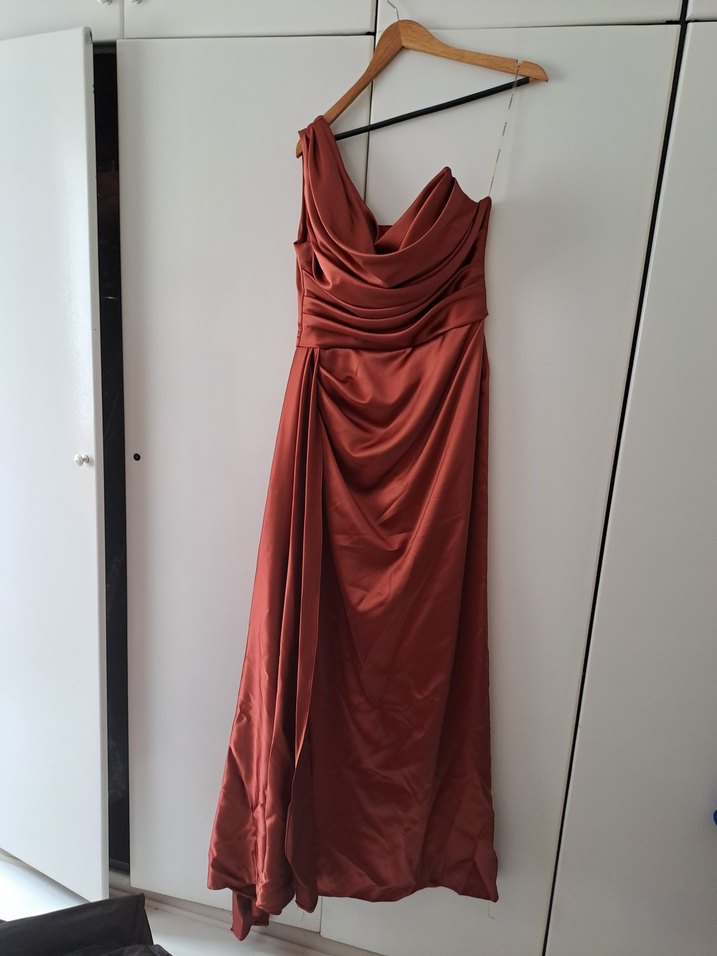 kiremit renk, drapeli ve askılı uzun abiye elbise. Parlak kumaşıyla modern klasik tarzda, düğünler için uygun.ipek saten yumusak esnek kumas. bir kez 2 saat giyildi. esnetilmeden olcusu iki koltuk alti arasi 44cm bel 39cm omuzdan asagi 158cm