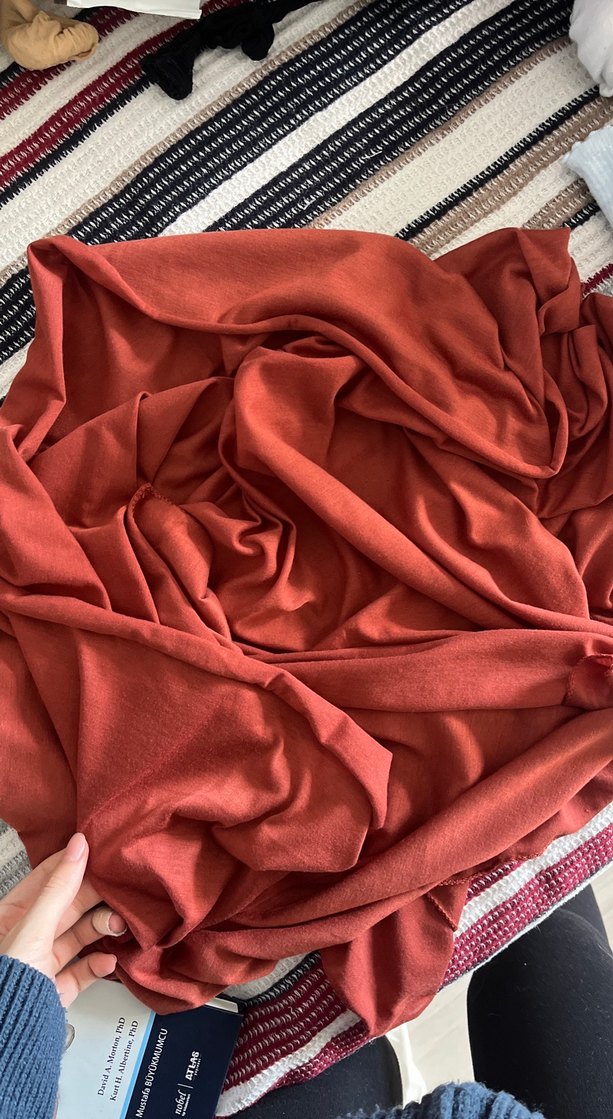 Kiremit renkte, dökümlü tasarıma sahip kadın şalı, yumuşak sentetik kumaştan üretilmiş, parlak ve rahat bohem tarz sunar.