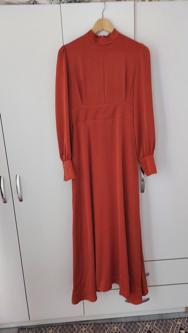 Kiremit renkte, yüksek yakalı ve uzun kollu kadın elbisesi. Pamuk saten kumaş,astarlı, bol kesim ve drapeli tasarıma sahip, özel günler için uygun.