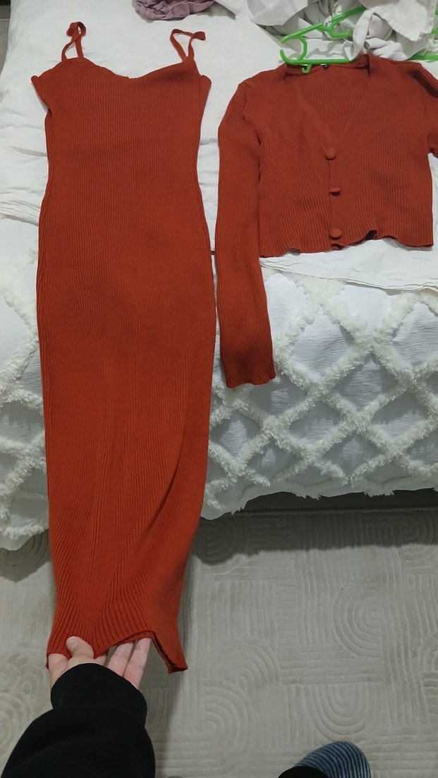 kiremit, askili ve kruvaze yaka, düğme detaylı, uzun ve vücuda oturan sentetik kumaş triko elbise. Günlük kullanıma uygun minimal normcore tarzı.