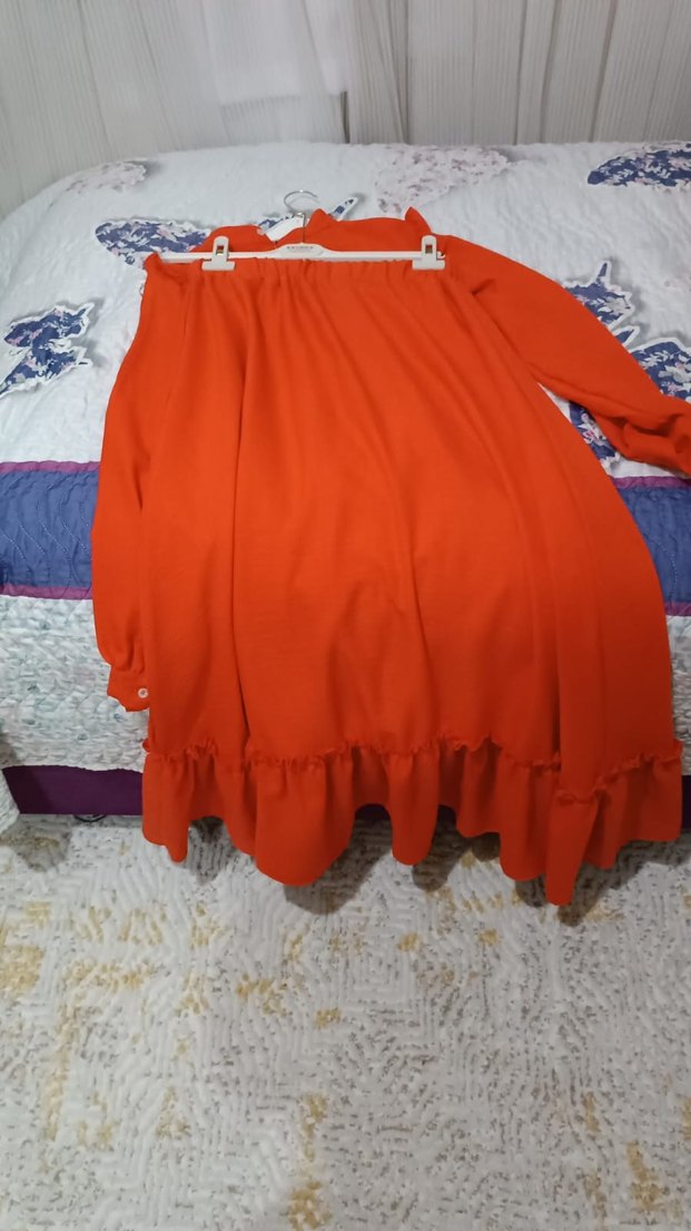 Kiremitı renkli, uzun boylu ve bol kesim hamile eteği, etek ucunda fırfır detayına sahiptir. Yumuşak ve sıcak kumaştan yapılmıştır, bohem tarzına uygundur.