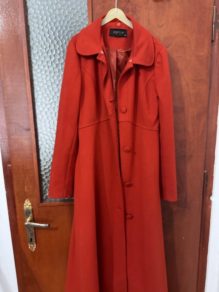 Klasik yakalı, düğmeli kiremit uzun kadın kaban, sıcak ve şık bir görünüm sunar. Soğuk havalar için uygundur. Bir kaç kere giyildi. Kilo alınca giyemedim