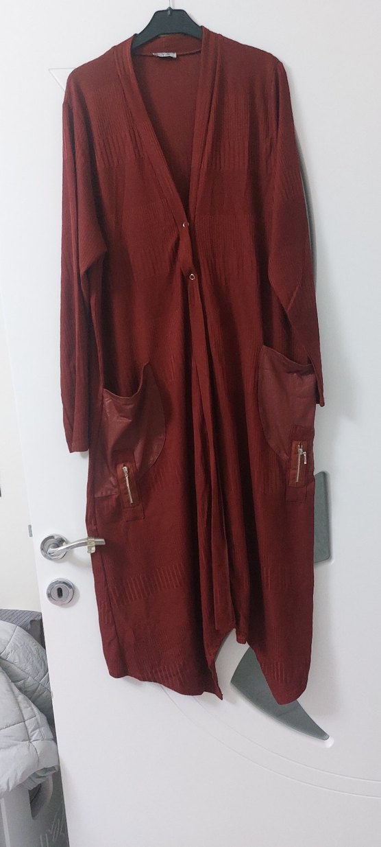 kiremit uzun keten kadın kaban, düğmeli ve uzun kollu, bol kesimdir. Keten kumaştan, yakası kesik ve fermuarlı ceplidir. Günlük kullanıma uygundur.