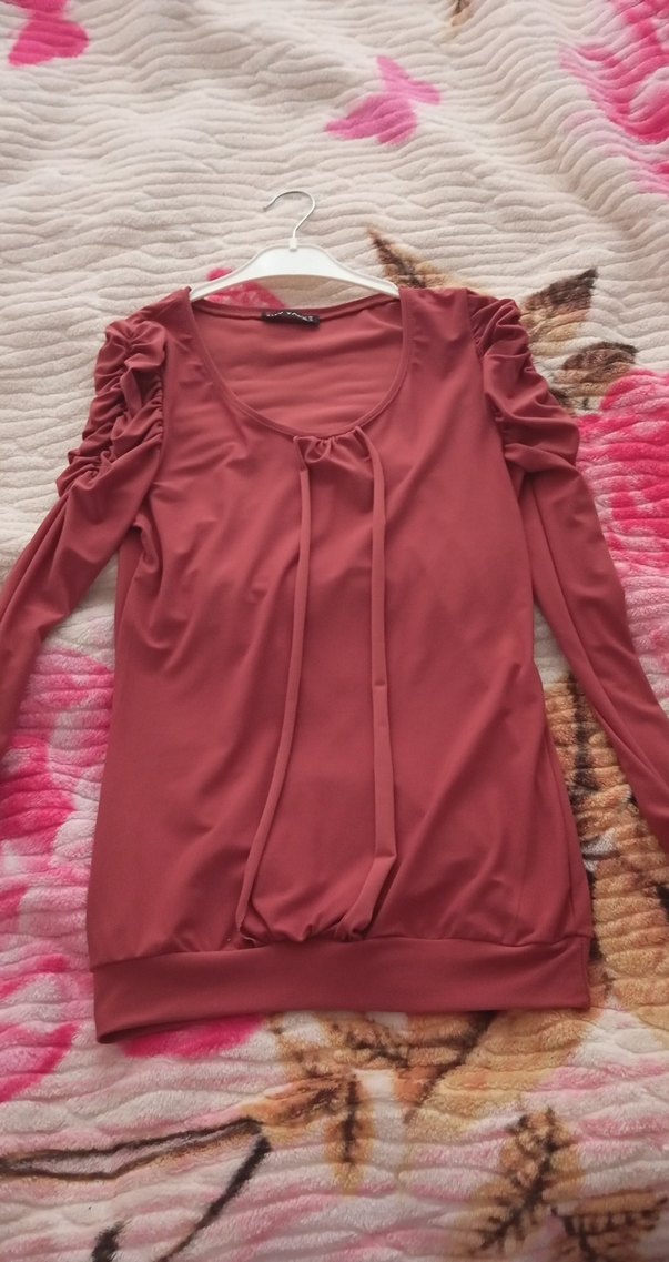 kiremit renkte, drapeli ve büzgülü kollara sahip, yumuşak sentetik kumaştan uzun kollu bluz. Dar kesim ve yuvarlak yakalı, günlük sokak stili için uygun.