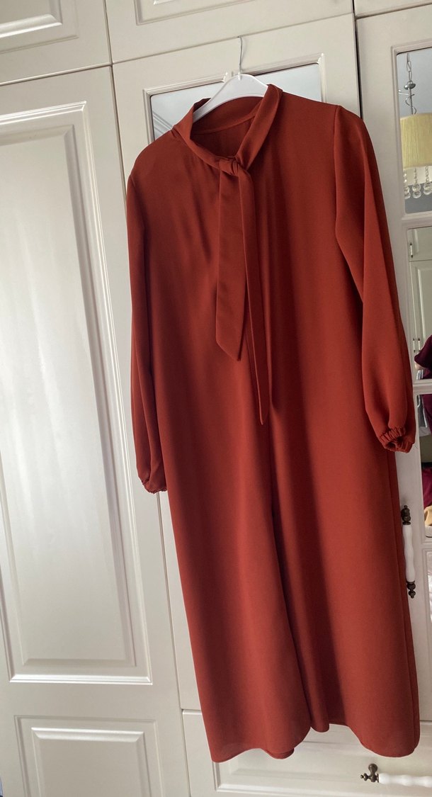 Uzun, bol kesim elbise, drapeli tasarımı, yüksek yakası ve uzun kollarıyla dikkat çeker. Petekli krep kahverengi kumaştan yapılmış, parlak yüzeye ve minimalist stile sahiptir. 122 cm boy 42-44 uyumlu özel dikim