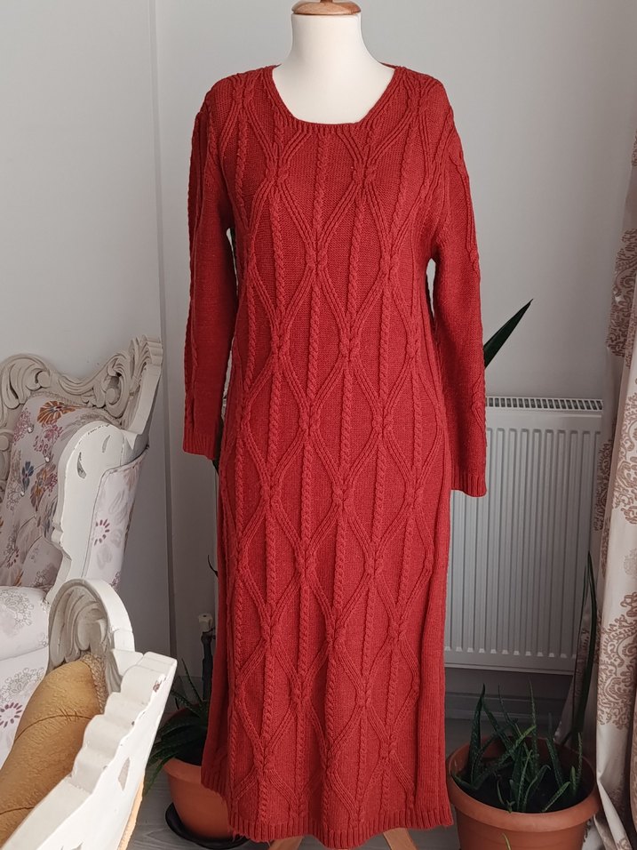 Kiremit renkli, uzun kollu ve yuvarlak yakalı örgü kadın elbisesi, bol kesimi ve uzun boyuyla rahat bir görünüm sunar. Günlük kullanıma uygundur.