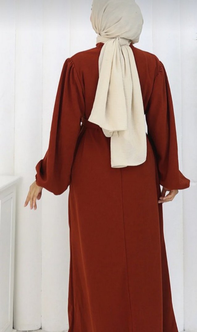 Kiremit renkte, yüksek yakalı, uzun kollu ve drapeli detaylara sahip salaş kesim elbise. Günlük kullanıma uygun, sentetik kumaştan üretilmiştir.
