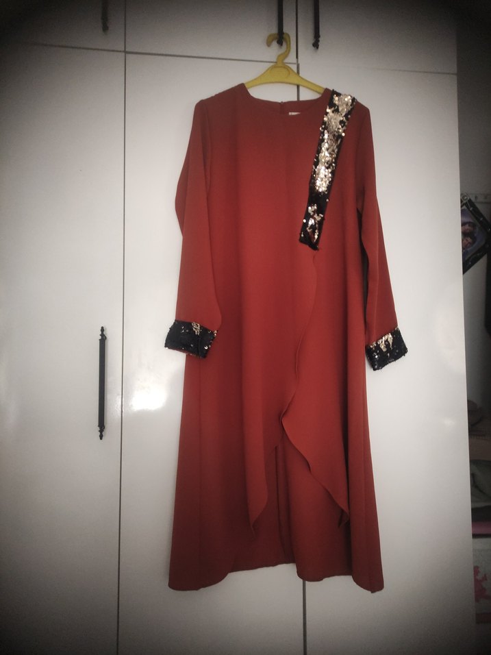 kiremit renk, uzun kollu, salaş kesim, drapeli ve yüksek yakalı elbise. Omuz ve manşetlerde işleme detayları bulunur, yumuşak sentetik kumaştan üretilmiştir.