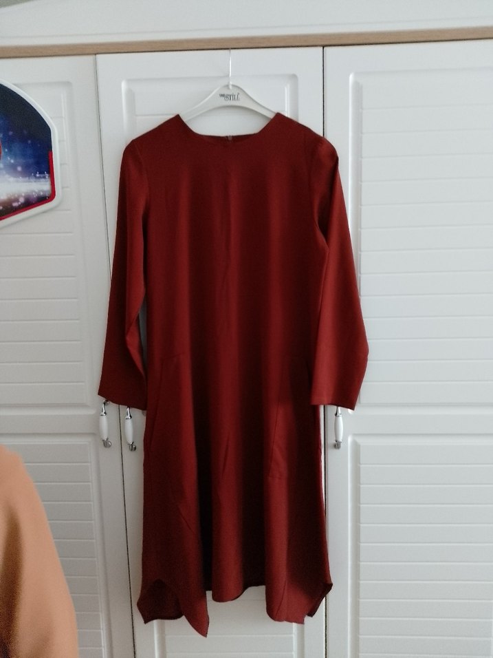 kiremit renkte, uzun kollu ve salaş kesim kadın tunik. Dökümlü tasarımı ve ipeksi dokusu ile günlük kullanıma uygundur. Minimalist ve sade stil için idealdir.