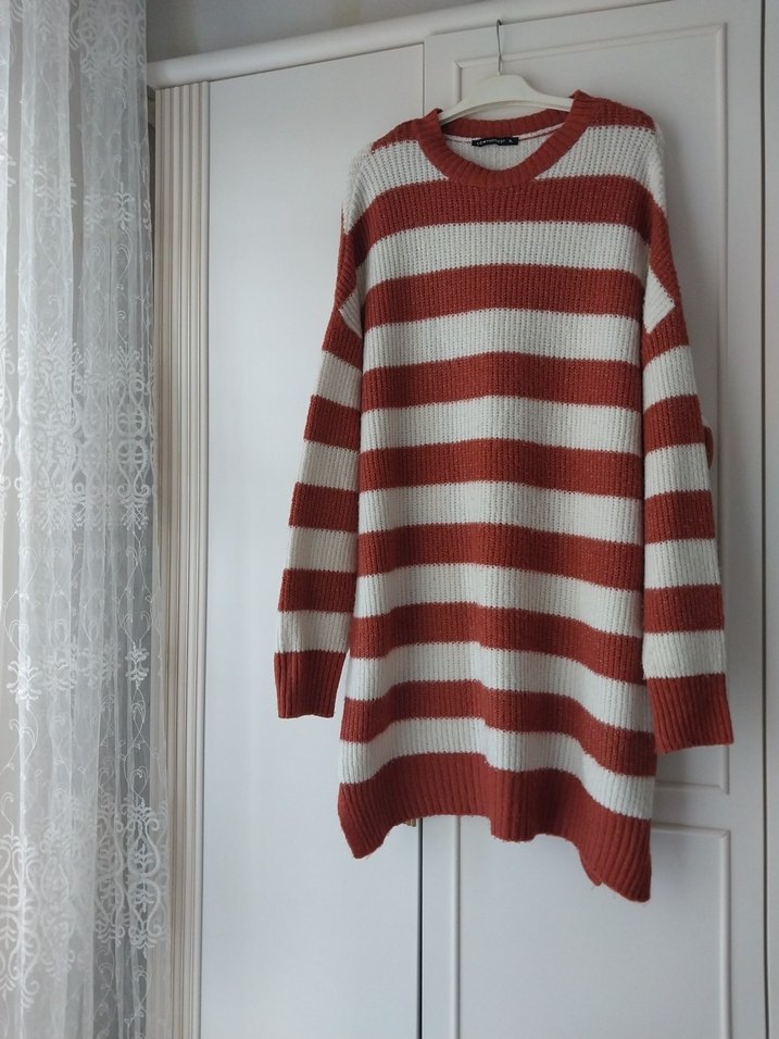 kiremit ve krem rengi çizgili, uzun kollu örgü kadın kazak. Salaş kesimli, yuvarlak yakalı ve midi boyda, rahat ve günlük kullanıma uygun.
