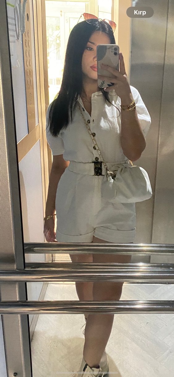 Beyaz deri mini tulum, yakalı ve askılı kollu, kemerli ve vücuda oturan kesime sahip. Günlük kullanıma uygun, şık sokak tarzı.