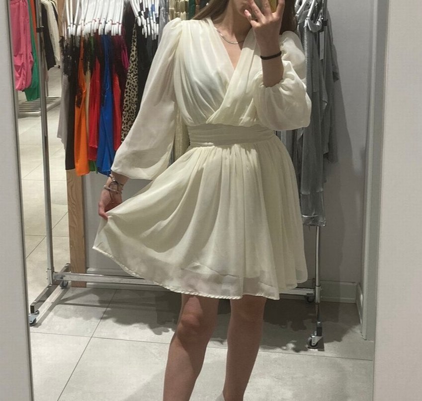 Beyaz drapeli mini elbise, V yaka ve uzun kollu, bol kesim, yumuşak sentetik kumaştan. Bohem tarzıyla düğün ve günlük kullanıma uygundur. Mezuniyetimde kullandım sadece tertemiz çok güzel bir elbise. Markası Zara değil.