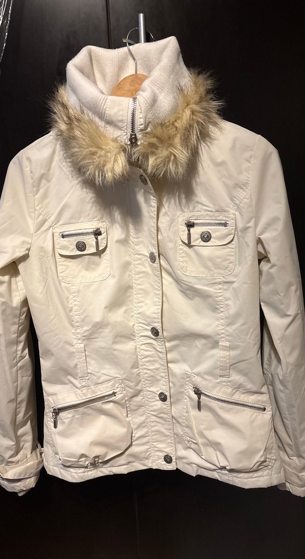 Kırık Beyaz, kemerli, uzun kollu, notched lapel yakalı, çok cepli, suni kumaştan kadın ceket. Sokak stiline uygun dış mekan kullanımı için ideal. ❄️