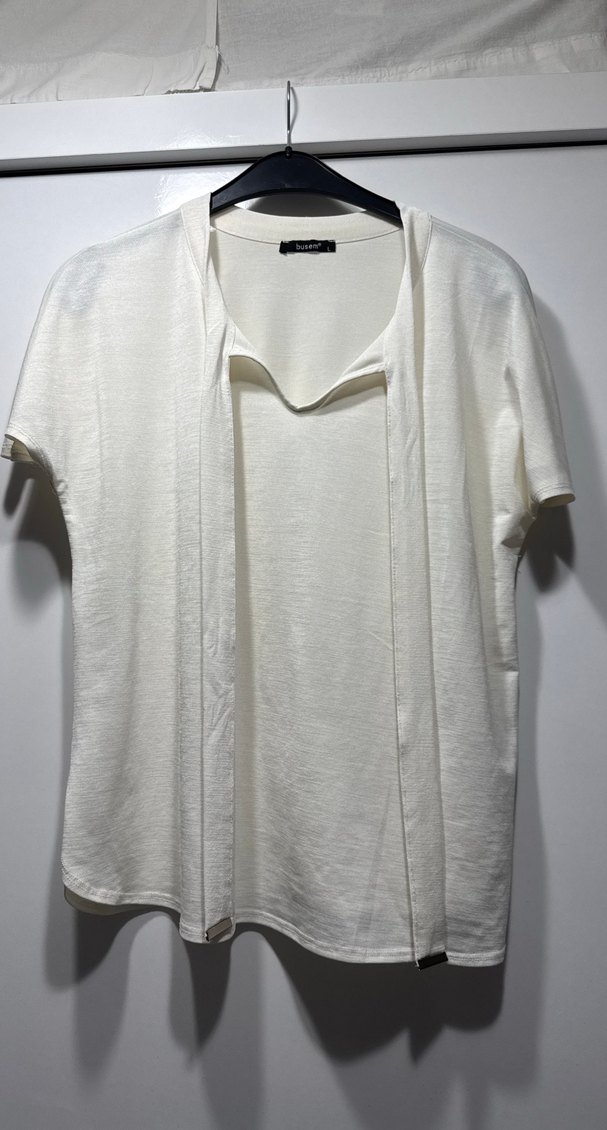 Kirik beyaz, kısa kollu ve baglamali yaka olan bu kadın tişörtü, rahat kesimiyle günlük kullanıma uygun sade ve şık bir görünüme sahiptir. Hicbir sorunu yoktur