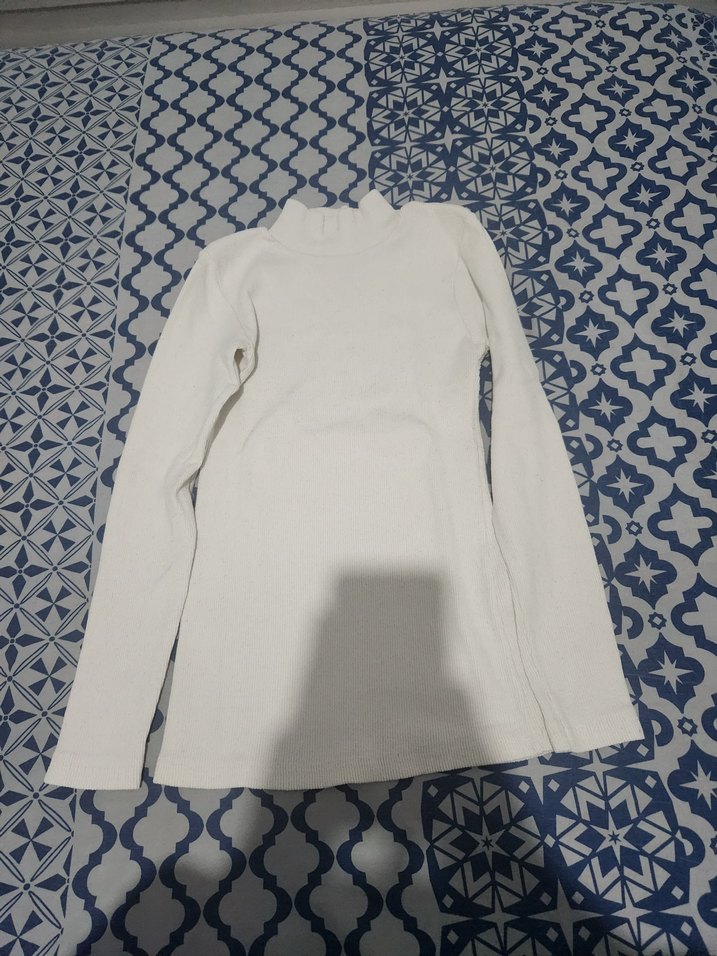 Beyaz renkte, uzun kollu ve boğazlı, pamuklu kumaştan yapılmış, sade ve rahat kesimli kadın kazak. Günlük kullanıma uygundur.