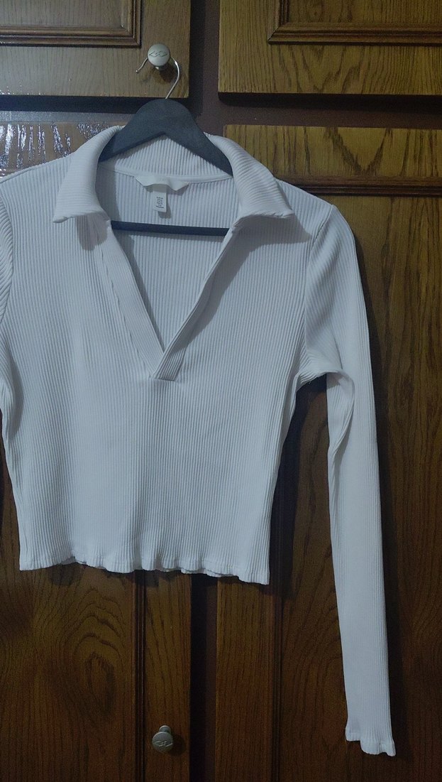 Beyaz renkte, (kırık beyaz)V yaka ve uzun kollu, kısa uzunlukta, sentetik kumaştan yapılmış, kadınlar için dar kesim bluz boyu 45 cm koltuk altı 40 cm S ve M beden ıçın genç kızlar için ideal.. kol boyu 60 cm