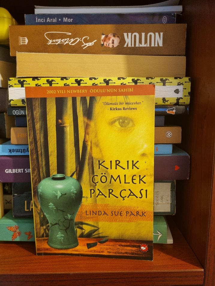 Linda Sue Park'ın 2002 Newbery Ödüllü kitabı "Kırık Çömlek Parçası" sarı arka plan ve yeşil bir vazo resmiyle dikkat çekiyor.