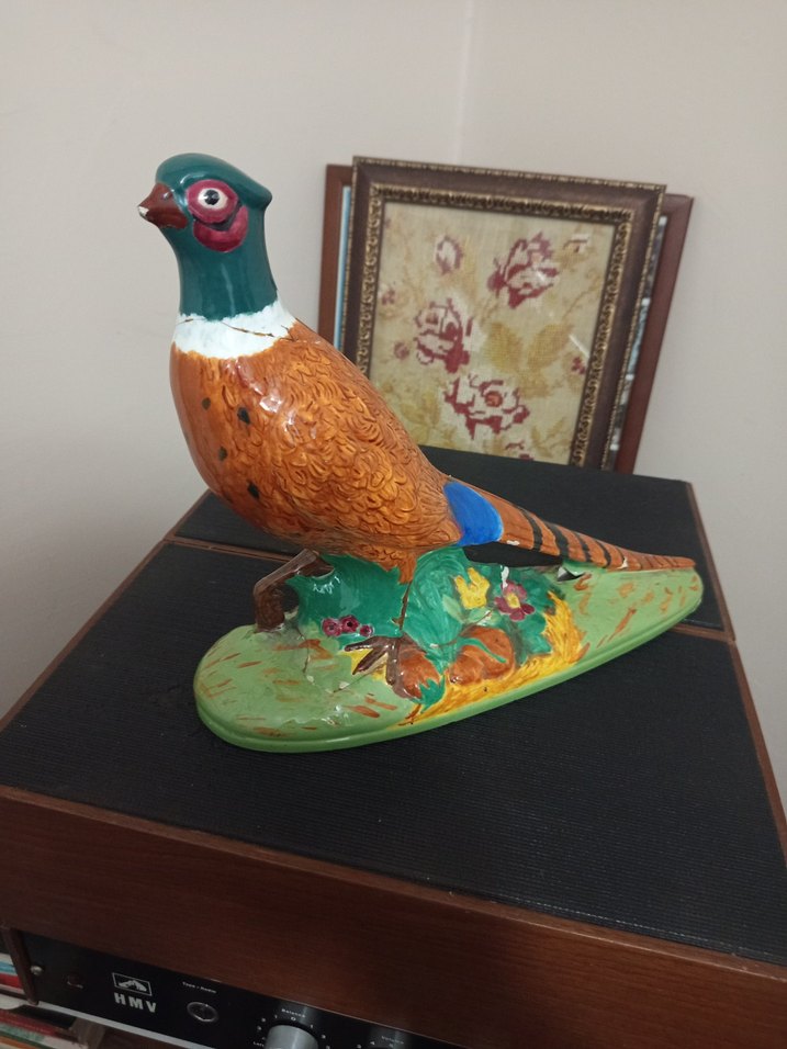 Renkli seramik malzemeden yapılmış, detaylı tüyleri olan kahverengi, yeşil ve mavi tonlarında sülün figürü.
