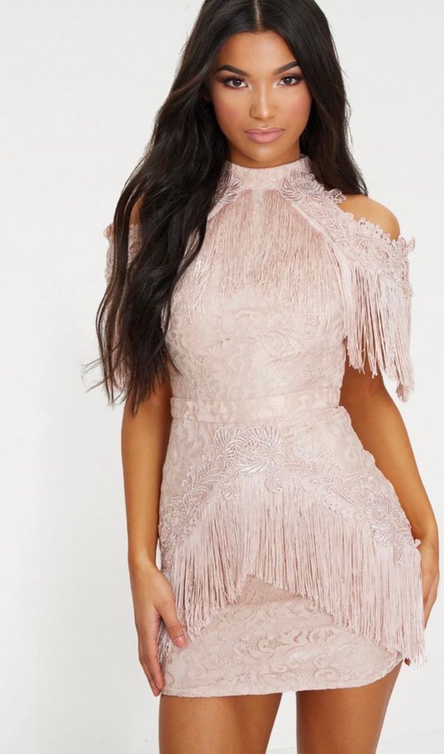 Şampanya renkte, dantel ve işlemeli detaylara sahip, yüksek yakalı, askılı ve püsküllü kol detaylı, mini boy dar kesim elbise.