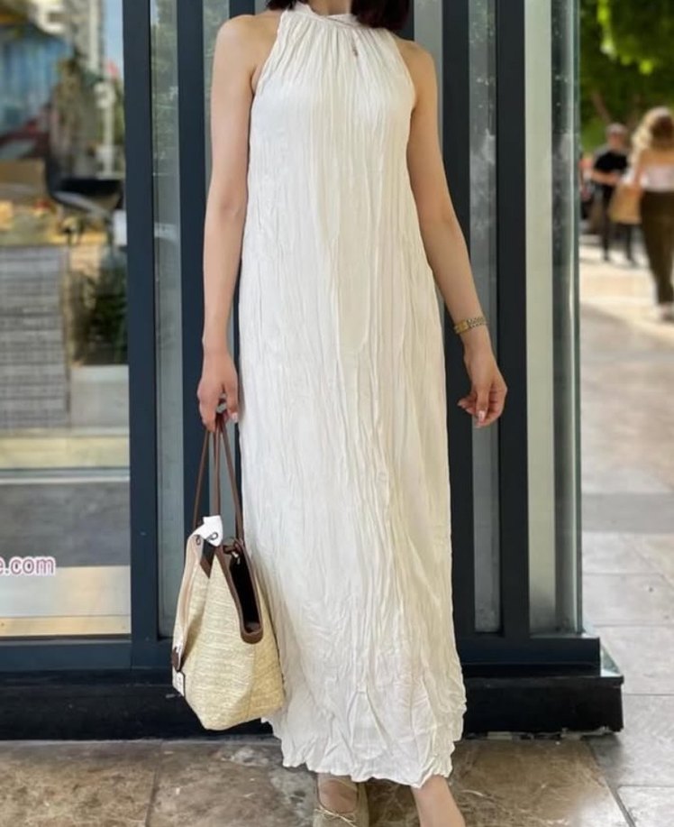 S-M-L-XL beden seçeneği❤️ Krem, boyundan bağlamalı ve salaş kesim uzun elbise. Drapeli ve minimal tasarımlı, bohem tarzda günlük kullanıma uygun.