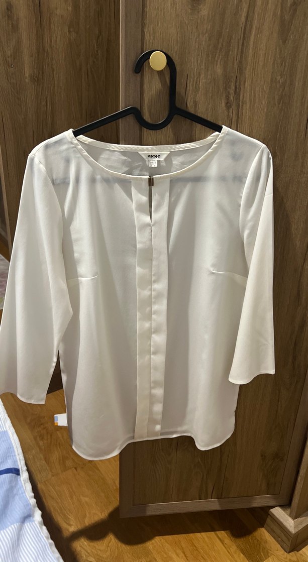 Beyaz, dirsek kollu kadın bluz. Rahat kesimi ve ipeksi dokusuyla ofis için uygun, sade ve desensiz normcore tarzda. 34 beden yazıyor ancak salaş
